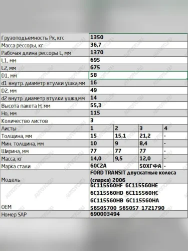 | Наименование | Рессора FORD Transit (06-13) задняя (3 листа) со втулк. антискрипными прост. L=1405мм ЧМЗ SPRINGER ЧМЗ 771503fd-2912012-10 в Ставрополе Ставропольском крае |